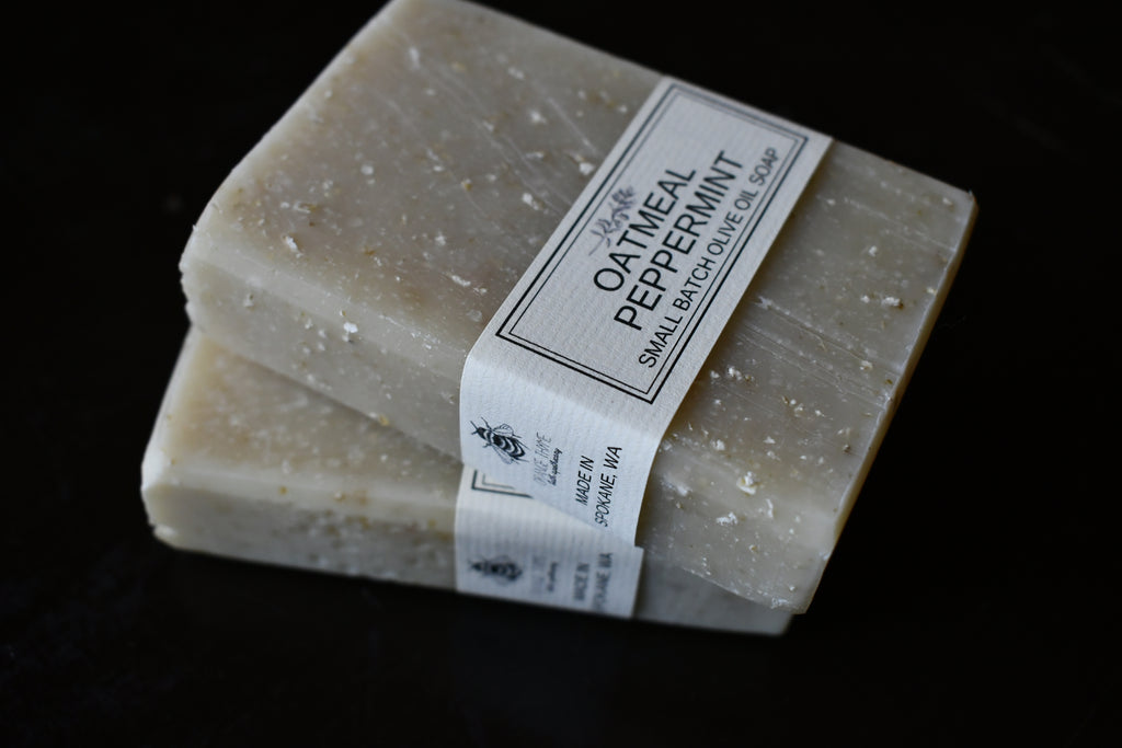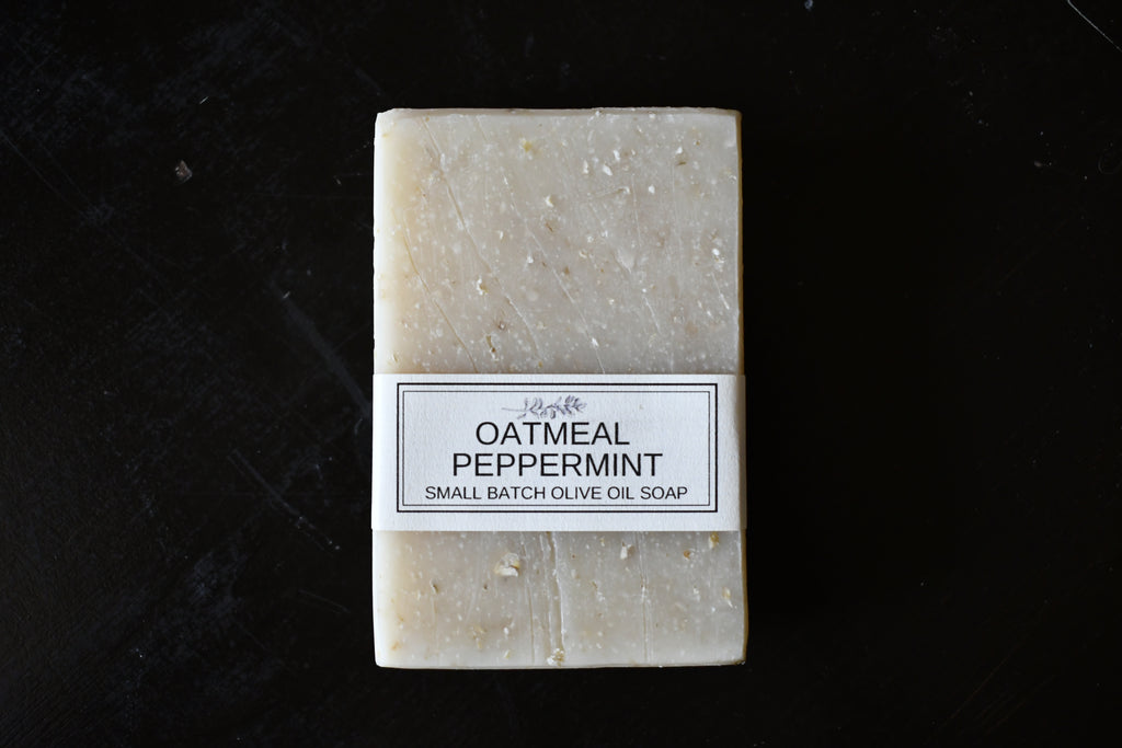 Saponified Olive Oil, Purified Water, Sustainable Palm Oil & Coconut Oil,  pure peppermint essential oil, ground gluten free oats